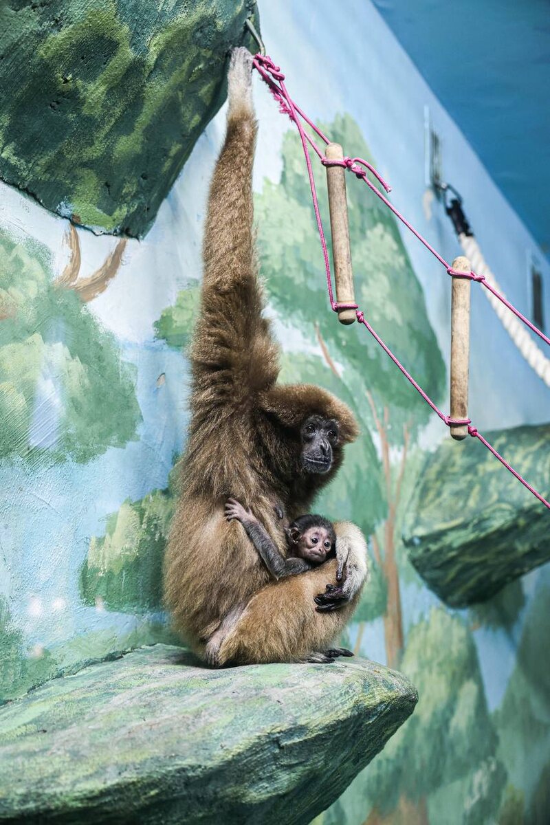 В Екатеринбургском зоопарке пополнение — 28 января у пары белоруких гиббонов, Геры и Рокки, родился малыш. Пол детёныша пока неизвестен: мама не отпускает его ни на минуту и бережно прячет, а отец активно защищает семью. Чтобы поддержать здоровье Геры и развитие малыша, в её рацион добавили кальцинированный творог и ягоды. Сейчас детёныш уже окреп, растёт и с интересом изучает мир — особенно ему нравится слушать «пение» родителей, и, кажется, он даже пытается подпевать. Гиббоны известны своими вокальными дуэтами: они «поют» по-разному в зависимости от пола, возраста и даже территории. А ещё это очень умные приматы — они умеют пользоваться простыми инструментами и выражают эмоции с помощью мимики. Читай новости Берёзовского в ВК | МАХ