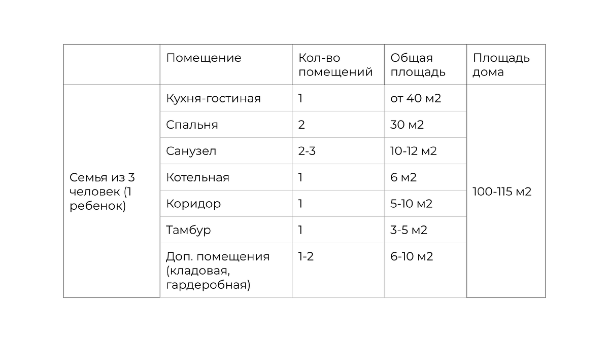 Снизу вы видите таблицу, где представлена идеальная площадь дома с разбивкой по помещениям для разного состава семьи.