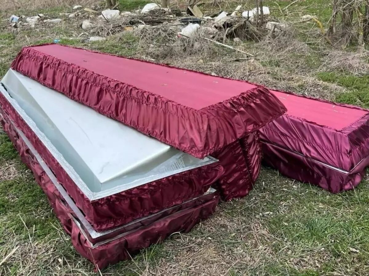 На кадрах видно, что гробы выглядят новыми – они обиты красной тканью и не повреждены. Жителей удивило, что кто-то решил их выбросить. Согласно ценам по городу Азову, самый «простой» гроб можно купить по стоимости от 20 тысяч рублей и выше.