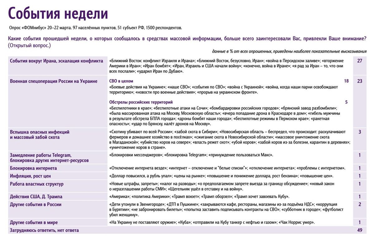 Поле мнений. Выпуск 12 События недели и настроение окружающих Результаты еженедельного опроса 20 – 22 марта 2026 года. Полный выпуск: fom.ru #доминанты #ФОМнибус 📱 Фонд Общественное Мнение