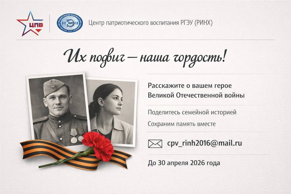 ) запускает акцию «Их подвиг-наша гордость!». Данная акция направлена на увековечение памяти о родственниках сотрудников и обучающихся, принимавших участие в Великой Отечественной войне. В рамках акции каждому желающему необходимо: 1. Подготовить фотографию своего родственника — участника Великой Отечественной войны; 2.Подготовить свою фотографию; 3. Указать ФИО родственника; 4. Прописать годы жизни (рождения и смерти) родственника; 5. Кратко описать боевой путь: участие в сражениях, награды, род войск, иные значимые факты(при наличии); 6. Завершить материал словами благодарности за подвиг и вклад в Победу. 🪖Собранные материалы будут использованы для оформления публикации на официальных информационных ресурсах университета. Просим направить подготовленные материалы в срок до «30» апреля 2026 года на адрес электронной почты: cpv_rinh2016@mail.ru