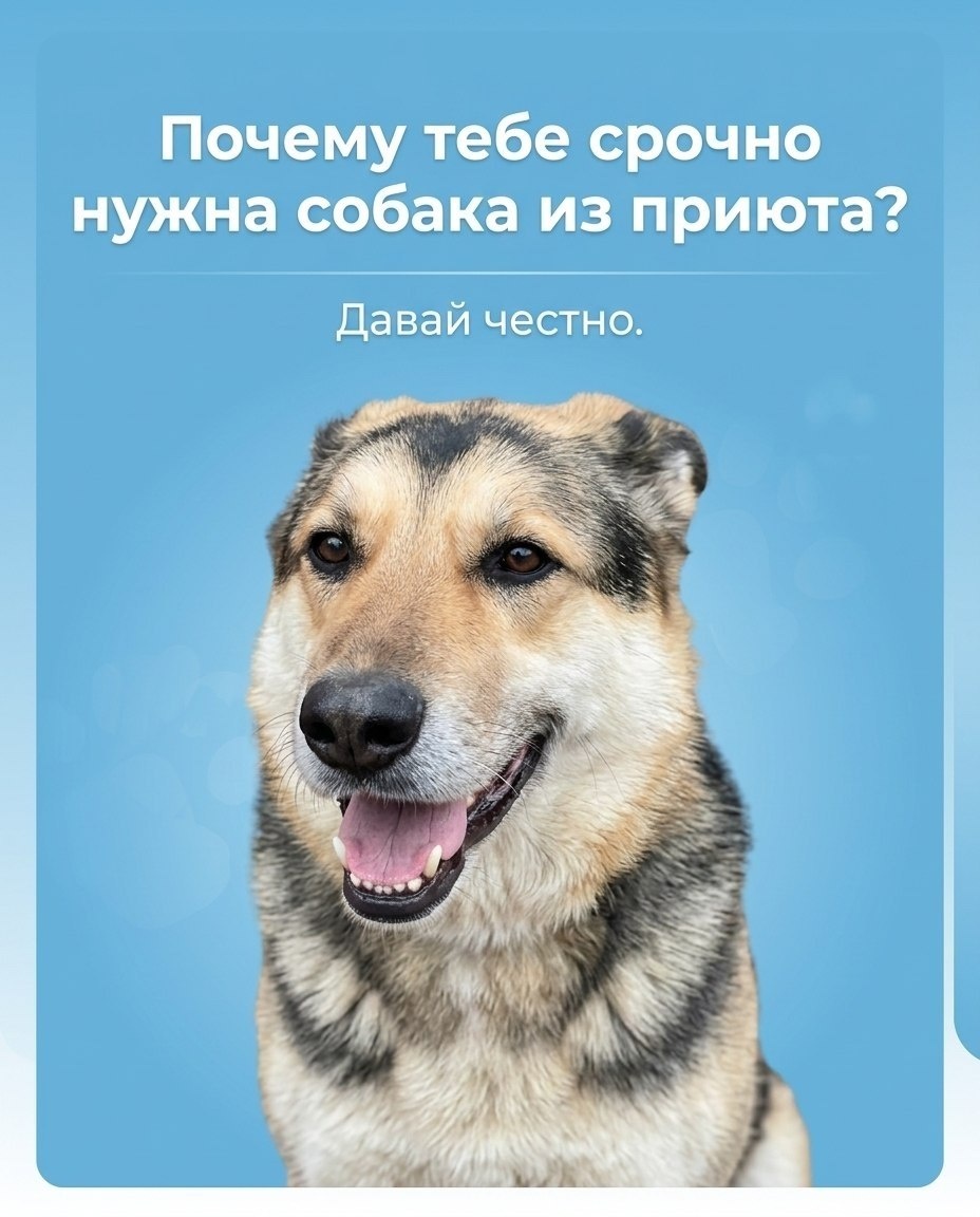ПОТОМУ ЧТО ДЛЯ КОГО-ТЫ БУДЕШЬ ЕДИНСТВЕННЫМ ШАНСОМ Приютские собаки - это не «второй сорт». Это те, кому просто не повезло. Родились не в тот день, не в том месте, не у того человека. А теперь они ждут, кто-то год, кто-то три, кто-то всю жизнь. Когда ты приходишь в приют и забираешь одного - ты освобождаешь место для другого. Это не красивые слова, это реальность. У нас живет много хвостиков, и каждому нужен человек, может именно ты. 2. ПОТОМУ ЧТО СОБАКА ДЕЛАЕТ ЖИЗНЬ ЛУЧШЕ И ЭТО ДОКАЗАНО Собака - это не просто «милое существо», это вклад в твоё здоровье. С ней ты будешь больше двигаться, даже если не до спорта. Меньше чувствовать себя одиноким, чаще смеяться, быстрее выходить из стресса. Жить в более понятном, стабильном режиме. Учёные давно заметили: владельцы собак реже страдают от сердечно-сосудистых заболеваний и в целом живут дольше, не мистика. Просто жизнь с собакой заставляет заботиться о себе «между делом». 3. ПОТОМУ ЧТО ДАЖЕ «ЛЕНЬ» С СОБАКОЙ РАБОТАЕТ В ТВОЮ ПОЛЬЗУ Знае