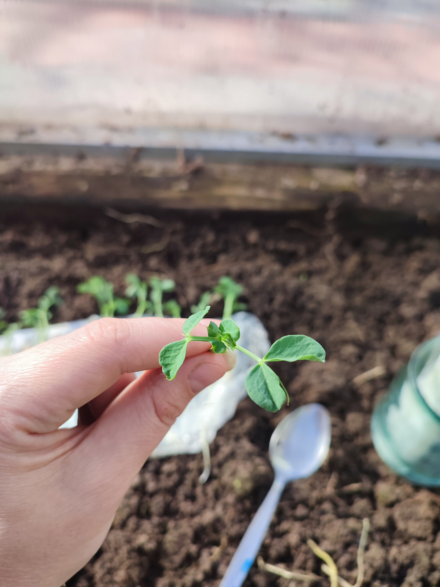 - Аккуратно достаю саженец горошка.
