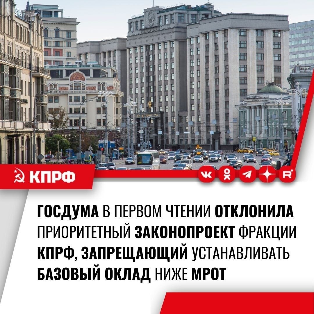 ⚠️Госдума в первом чтении отклонила приоритетный законопроект фракции КПРФ, запрещающий устанавливать базовый оклад ниже МРОТ