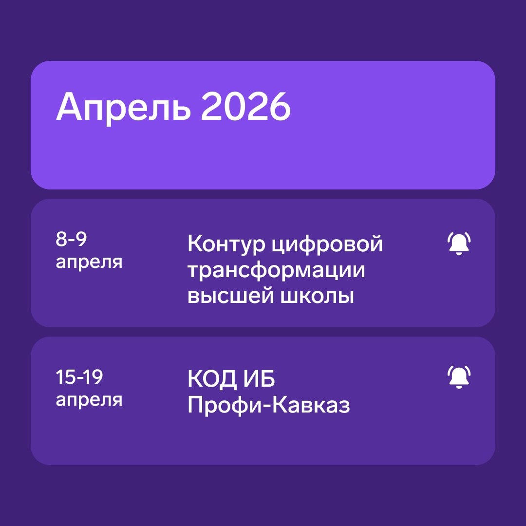 ▪️ Контур цифровой трансформации высшей школы — 8–9 апреля Сегодня все вузы стоят перед необходимостью цифровой трансформации. О том, как эффективнее обеспечить такую трансформацию, а также решить вопросы импортозамещения и обеспечения информационной безопасности поговорим с представителями вузов со всей страны, а также ключевыми вендорами в ИТ-отрасли. 📍Сочи ▪️ КОД ИБ ПРОФИ | ДАГЕСТАН 2026 — 15-19 апреля Код ИБ ПРОФИ — это выездной интенсив по кибербезопасности. Впервые сбор пройдёт в Дагестане, где будут мастер-классы от сильнейших экспертов и путешествие по уникальным природным местам республики. 📍Дагестан