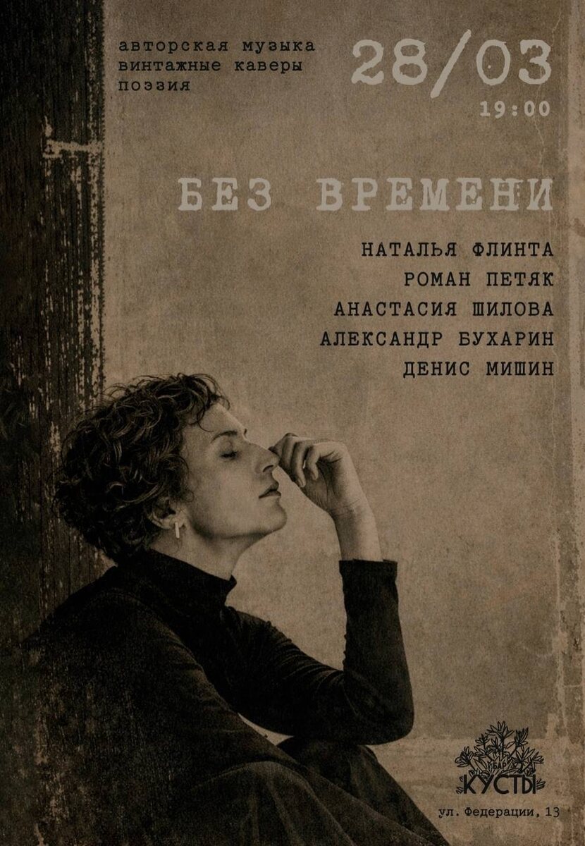 » 🗓️ 28 марта 19.00 📍«Кусты», Федерации 13 «БЕЗ ВРЕМЕНИ» - это атмосферный вечер, сотканный из авторской музыки, пронзительной поэзии и винтажных каверов самых разных стилей от джазовых стандартов до чувственного фолка. Представьте себе вечер, где самые разнообразные эмоции сплетаются воедино, где можно чувствовать все - от драматической лирики до хулиганского веселья. Виртуозные музыканты создадут живую, дышащую атмосферу, которая позволит вам прожить этот вечер по-особенному - вне времени. - Наталья Флинта - вокал, автор песен - Роман Петяк - гитара - Анастасия Шилова - клавиши - Александр Бухарин - скрипка - Денис Мишин - ударные 🏷️ от 800₽ Билеты 🎟️ #28марта26@culturnik 🕊️пойду • ❤️ нравится • ✅рекомендую