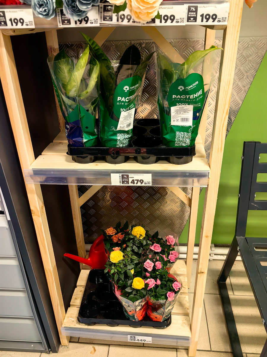 Друзья, вчера побывала в трех Пятеточках в поисках обновлений))) В одну из них заезжали специально. В прошлый заход там были нужные мне растения, но не работали кассы (только за наличку), так что надо было проверить остались ли они и в каком виде! Итак, заезд начали с нашей ближайшей Пятерки, которую только недавно закрывали на ремонт и после ремонта в ней еще растений не было. Теперь привезли немножко. Видимо, часть сразу разобрали и я успела к шапочному разбору))) Но все растения еще были свежие, приятно посмотреть! Тут присутствовали две Диффенбахии и один Кротон. По Кротонам у меня много потерь из-за клеща и по неизвестной причине. Надо восстанавливать популяцию. Но я хочу вполне конкретные, этот не из их числа. Хотя вид имел прямо очень жирненький! Кстати, на разных Диффенбахиях в разных магазинах наблюдала вот такие обесцвеченные пятна. Явно они такие уже приехали. Как будто выгорели под сильной лампой. Розочки свежие всегда вызывают только положительные эмоции)) Я вот все подумы