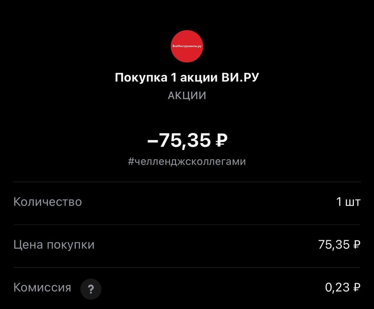 ! Сегодня покупка #385 Статистика портфеля на стороннем сервисе, можно посмотреть по "ссылке" Напомню это челлендж с коллегами, каждый рабочий день пополняем брокерский счет на 250 рублей и инвестируем. Если возникли вопросы или есть не понимание, что делать. Задавайте «тут» Покупка #385 🟢 “ВИ.РУ” 75.35 rub #VSEH 1 лот #каждыйсможет #челенджсколлегами TG MAX