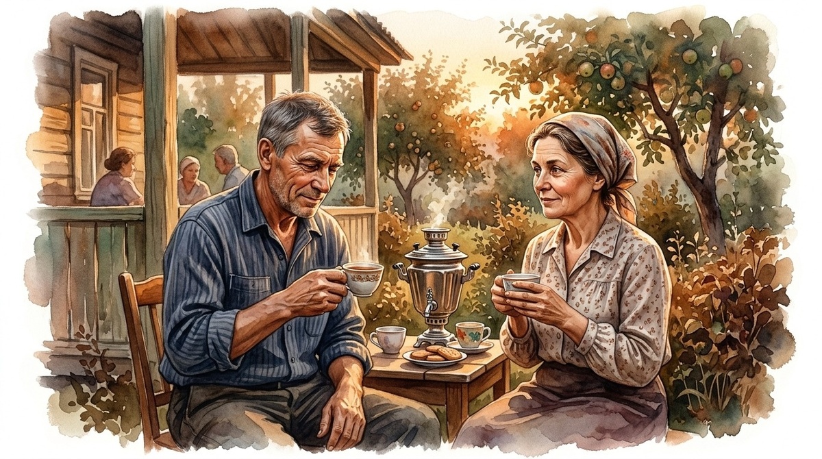 Нина стояла в дверях с двумя кружками чая. Вышла, села на новое крыльцо. Борис сел рядом, взял кружку. Пили молча. С огорода тянуло луком и влажной землёй — ночью прошёл короткий дождь. Где-то далеко гудел трактор.