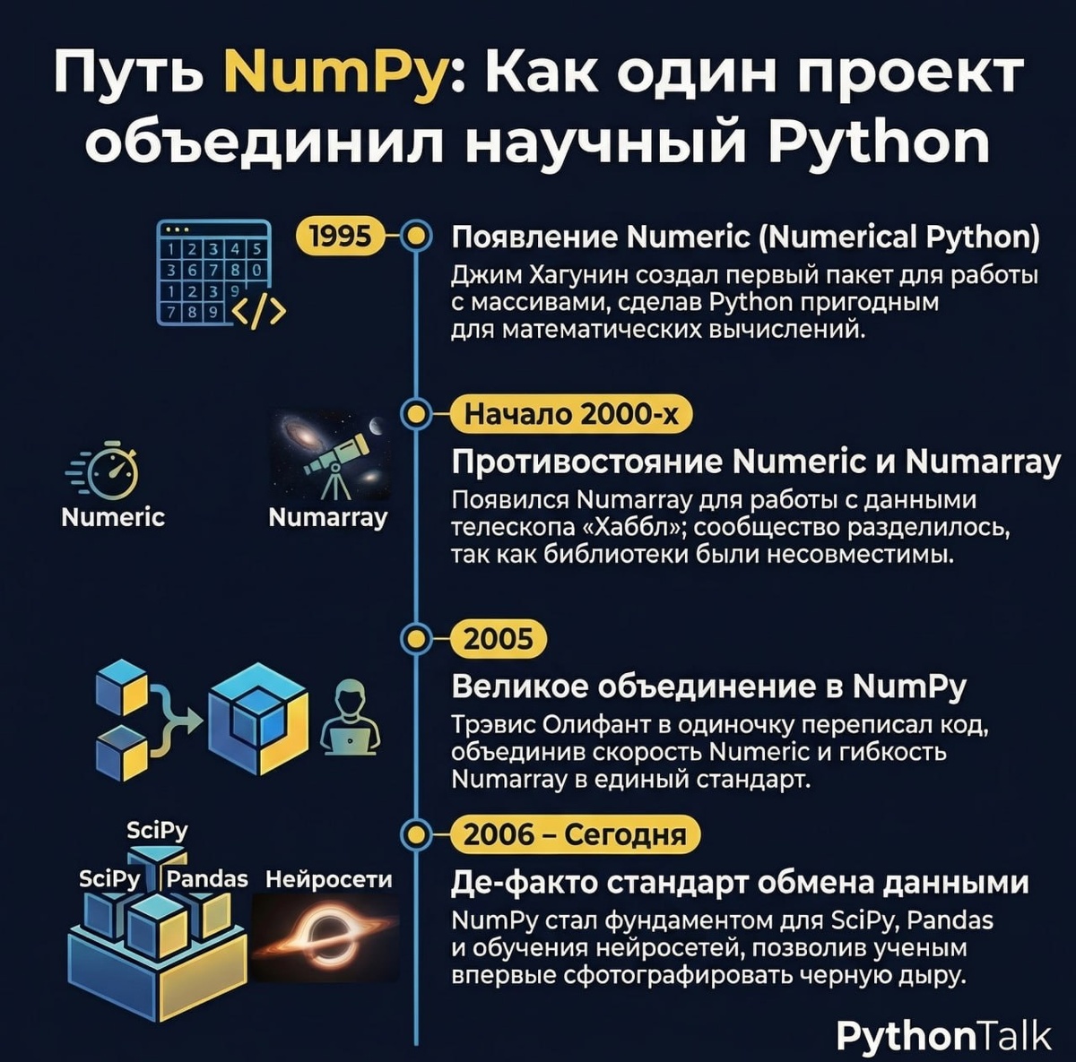 🔭 Сейчас вы пишете import numpy as np на автомате, даже не задумываясь, что за этой строчкой стоит опенсорс-драма, которая могла похоронить Питон как язык для Data Science еще в зародыше. Если бы в начале нулевых всё пошло по другому сценарию, сегодня мы бы грустно ворочали тензоры в R или мучились с плюсами. В 1995 году Джим Хагунин написал Numeric — первый вменяемый C-экстеншн для работы с многомерными массивами. До него Python в математике был просто медленным скриптовым языком. Но Numeric отвратительно справлялся с большими файлами. Это стало критичной проблемой для разработчиков, которым нужно было процессить гигантские снимки с «Хаббла». Ребята не стали контрибьютить в Numeric, а написали свой инструмент — Numarray. Он круто работал с гигантскими объемами данных телескопа, но безбожно сливал по производительности на мелких массивах. ⛓️💥 Итог: классический опенсорсный раскол экосистемы. Часть пакетов жестко зависела от Numeric, часть — от Numarray. Скрестить их в одном пайп