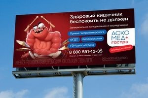 Рынок частной медицины на подъеме. Как выстроить свою стратегию продвижения? Знакомим с впечатляющей рекламной кампанией «АСКО-МЕД+». Больше года назад известный медицинский центр региона запустил новое направление — гастроклинику с полным спектром услуг для диагностики и лечения заболеваний желудочно-кишечного тракта, которые по распространенности занимают третье место среди всех остальных. Уникальной новинке рынка частной медицины требовалась рекламная кампания для привлечения внимания, популярности и лояльности. «Жители региона знают АСКО-МЕД как центр вакцинации, поскольку за 30-летнию историю компании к нам приводят прививаться уже своих детей пациенты, которые сами когда-то в детстве ставили прививки у нас. Поэтому мы обозначили перед собой цель ярко заявить о новом крупном направлении — гастроклинике. К типичным «продуктовым» форматам уличной рекламы барнаульцы уже привыкли, из-за чего и родилась идея сначала заинтриговать жителей нетипичной картинкой и слоганом, а далее раскрыт