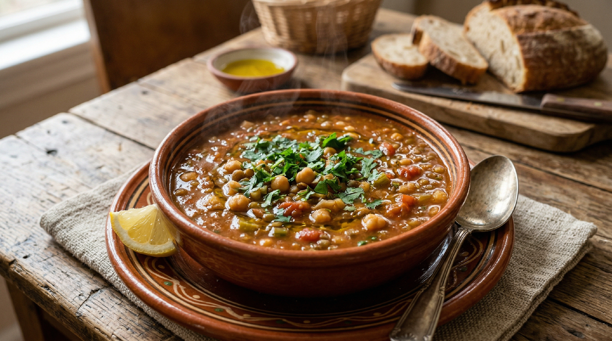 Я до того момента вообще не слышала такого слова. Марокканская кухня для меня существовала где-то на уровне кускуса и тажина — названия знакомые, но попробовать ни разу не доводилось. А тут — густой суп, в котором плавали мягкие горошины нута, кусочки томатов, зелень, и всё это пахло так, что хотелось просто уткнуться носом в тарелку и сидеть так долго-долго. Первая ложка — и я пропала. Это было что-то совершенно новое для моих рецепторов: одновременно сытное и лёгкое, пряное, но без жгучей остроты, с какой-то бархатной текстурой и долгим послевкусием.