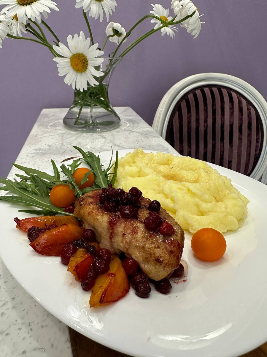 Нектаринами и Клюквой! 🟠Утиную грудку сначала обжаривает до золотистой корочки на сковороде.Затем,перекладываем в жаропрочную форму и в духовку минут на 10, температура 180 гр. 🔴Соус: На сковороду,где обжаривали грудку,добавляем кусочек сливочного масла. Обжариваем кусочки нектарина ,добавляем клюкву,мед. Карамелизуем. 🌺Подаем с салатом из зелени и овощей. ❤️У меня на ужин ещё было Картофельное пюре! 〰️〰️〰️〰️🌿🌿🌿🌿🌿 Приятного аппетита! #рецепт #бархатныйрецепт , #утинаягрудка,#ужин