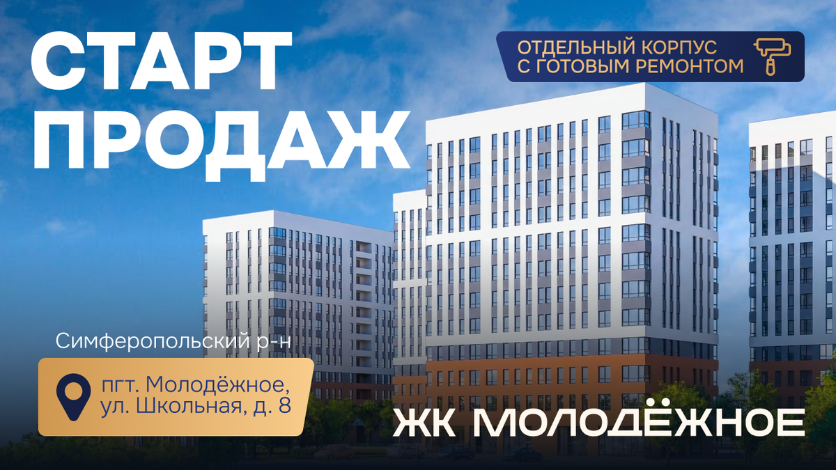 Такие проекты редкость! ЖК «Молодёжное» — это современный жилой квартал в экологически чистом районе для активных и амбициозных жителей Крыма. Мы стремимся создать жильё, где вечные ценности находят свое отражение и расцветают в полную силу! Уникальное предложение: первые квартиры по цене 148 000 ₽ за м²! Не упустите шанс приобрести квартиру на максимально выгодных условиях! Благоустроенная инфраструктура, детские и спортивные площадки — всё необходимое рядом с домом! Строим 3 очереди новых современных домов в пгт Молодёжное, используем новые строительные технологии! КЛЮЧЕВАЯ ОСОБЕННОСТЬ — ОТДЕЛЬНЫЙ КОРПУС С РЕМОНТОМ! Современный формат квартальной застройки — без ожидания отделочных работ и дополнительных затрат времени Комфорт в каждой детали: •Дизайнерские входные группы, безбарьерная среда •Высокие показатели тепло- и звукоизоляции •2 скоростных лифта в каждом доме •Квартиры с увеличенными оконными проёмами и видами на лесной массив Коммерция на первых этажах в 3 корпусах с витринн