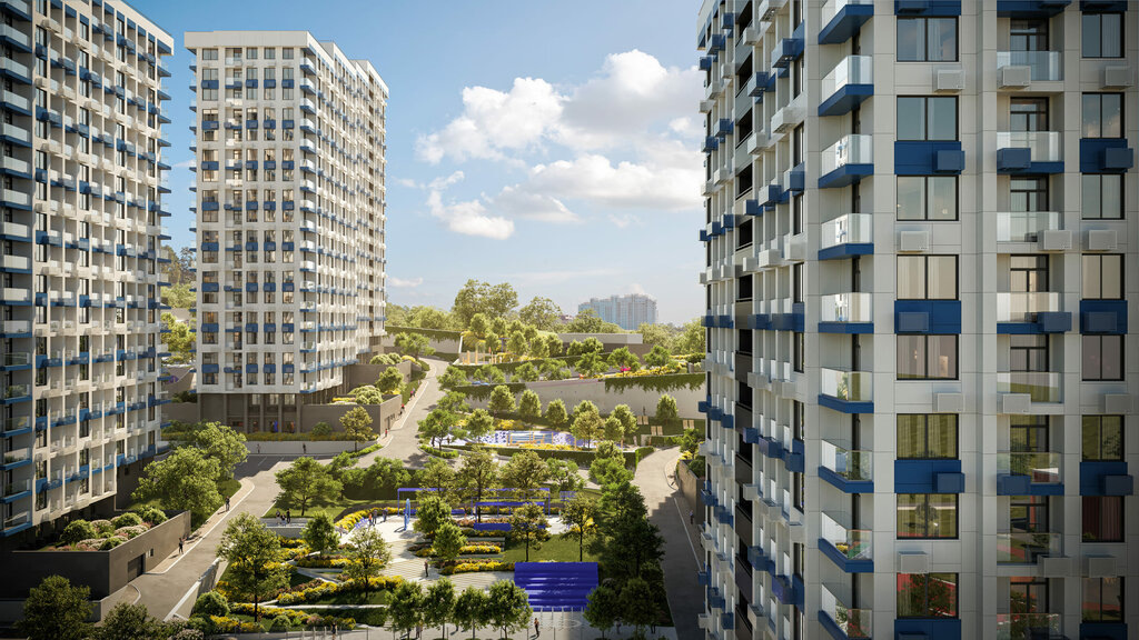 Проект включает 15 корпусов высотой 19 этажей, которые строятся по монолитной технологии. Архитекторы сделали ставку на гармоничную интеграцию в ландшафт. Фасады домов имеют светлые тона с контрастными синими акцентами балконов, что создает ощущение легкости и не перегружает визуальное пространство.