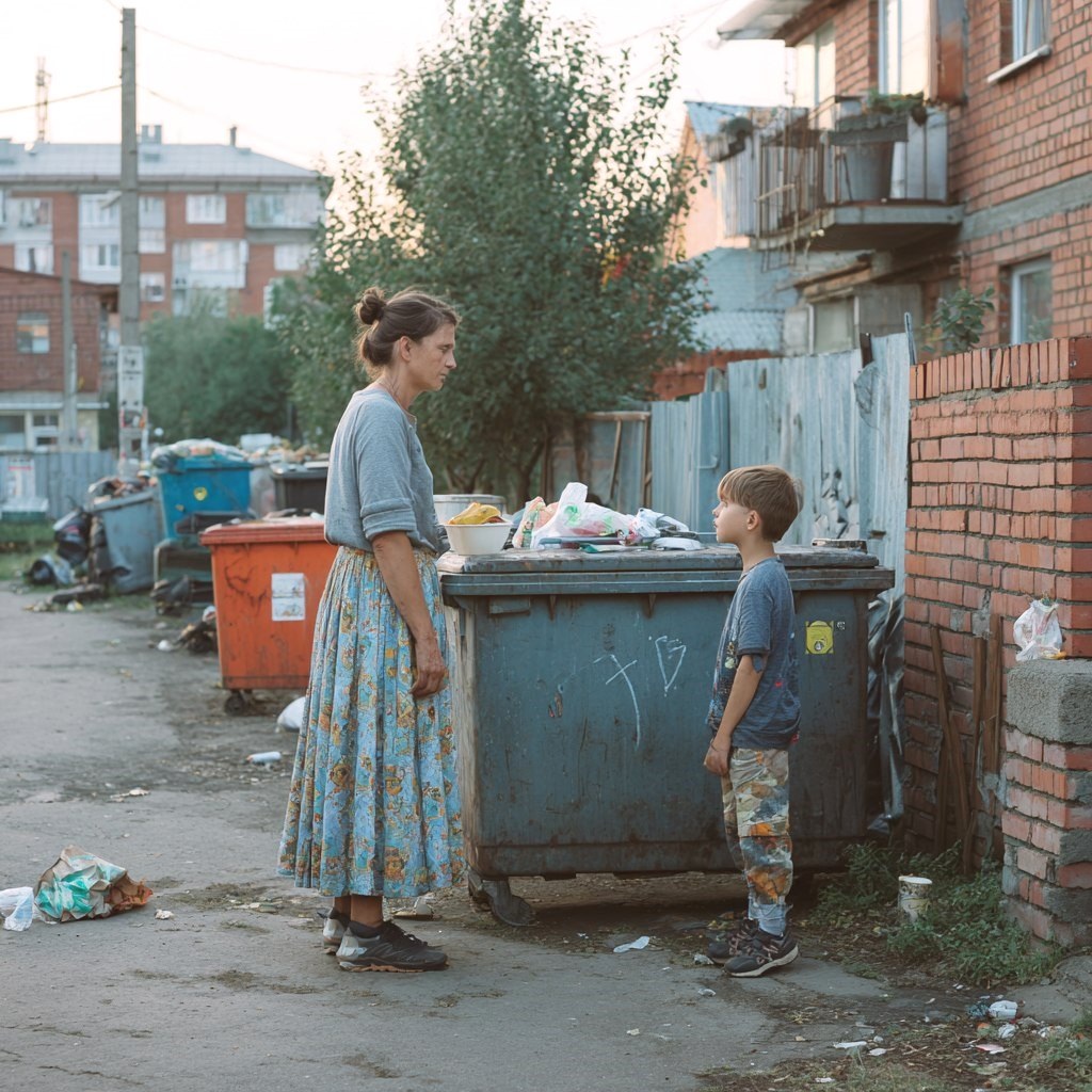 У мусорных баков около магазина мелькнули две фигуры — высокая и маленькая. Пожилой мужчина в потёртой куртке копался в отходах, рядом жался к нему мальчик лет шести в лёгкой ветровке не по сезону.