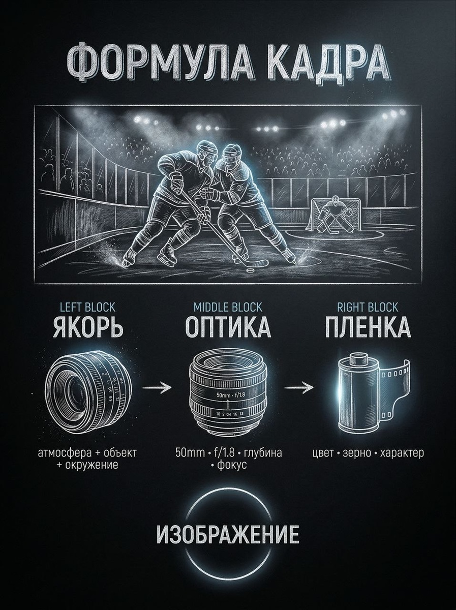 1. Сначала у нас «Якорь» — атмосфера, объект и окружение. Будь конкретен.⚓️ Пример начала промта на русском: АТМОСФЕРА и ОБЪЕКТ: хоккейный матч в разгаре, мутноватый свет аренных прожекторов, два игрока сталкиваются у борта, вратарь виден в площади ворот, толпа реагирует ОКРУЖЕНИЕ: крытая арена 1990-х годов, поцарапанные борта с выцветшей рекламой старых спонсоров, потёртые сиденья, защитное стекло со следами царапин, лёд изрезан коньками, в воздухе виден холодный пар от дыхания 2. Затем переходи к оптике. Не надо писать просто «cinematic» (кинематографично). Выбери визуал по настройкам камеры: фикс-объектив 50 мм, f/1.8, фокус зафиксирован на глазах игрока сквозь визор, малая глубина резкости, лёгкий шлейф движения на фоне, выдержка 1/500 с, ISO 1600, съёмка с рук на уровне борта, плотное кадрирование по грудь, борта пересекают нижнюю часть кадра 📷Какие диафрагмы и для чего использовать: f/1.4 — минимальная глубина резкости и максимальное размытие фона, сильное отделение объе