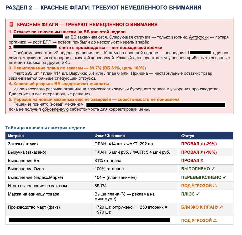 Каждый день он заходит в аналитику продаж и РНП ( рука на пульсе ) и делает скан по показателям, а еженедельно на планерке предоставляет отчет по всем метрикам компании ( можете увидеть на скрине ). Это база. Без этого дальше двигаться просто нет смысла. Собирайте как можно больше данных в онлайн-формате. Как закрыть все вопросы по аналитике одним инструментом - рассказал в посте 👇 https://dzen.ru/media/vsegdaprosto/drr-19-eto-ne-prigovor-69c16464a9b144533673a81c Ключевые метрики - план-факт по каждому маркетплейсу, прогноз прибыли на следующую неделю, ДРР. Без лишнего. Остатки - сколько дней товара при текущих продажах. Один показатель, одно решение: докинуть рекламу, поднять цену или срочно отгрузить. Гипотезы по каждому SKU - что сделать, чтобы улучшить результат. Нейронка не просто описывает факты, она предлагает действие. Топ-10 приоритетов на неделю - с расчётом эффекта. Задачи по сотрудникам - кто, что, зачем. Всё это собирается минут за 10. Важный момент: это не промпт о