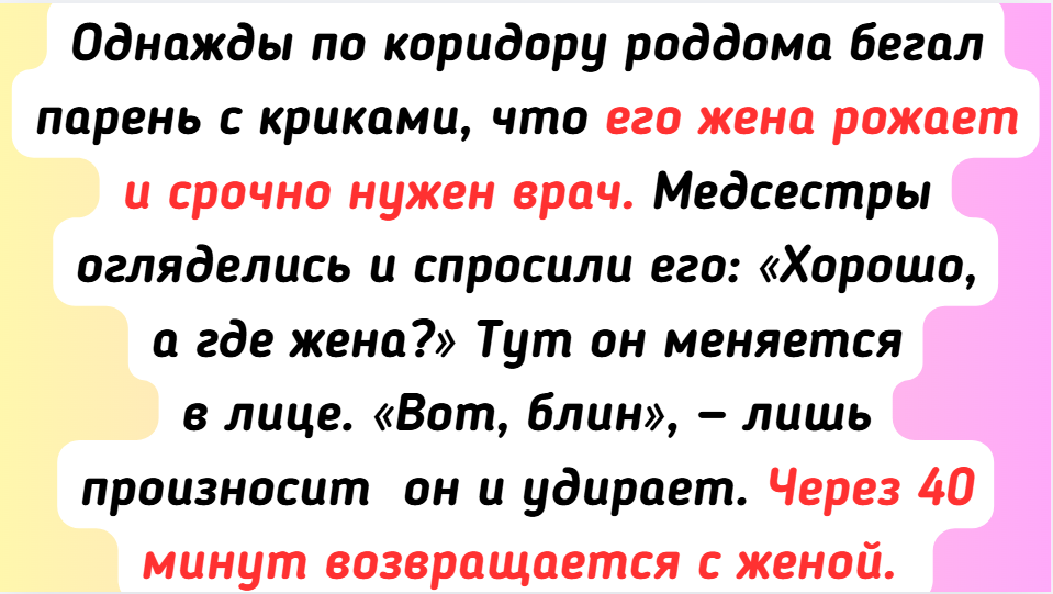 - Однажды по коридору роддома бегал парень с криками, что его жена рожает и срочно нужен врач. Медсестры огляделись и спросили его: «Хорошо, а где жена?» Тут он меняется в лице. «Вот, блин», — лишь произносит он и удирает. Через 40 минут возвращается с женой. Оказывается, он в спешке взял сумку в роддом, автокресло, оборудование для фотосъемки, привез это все в больницу, а жену забыл дома.