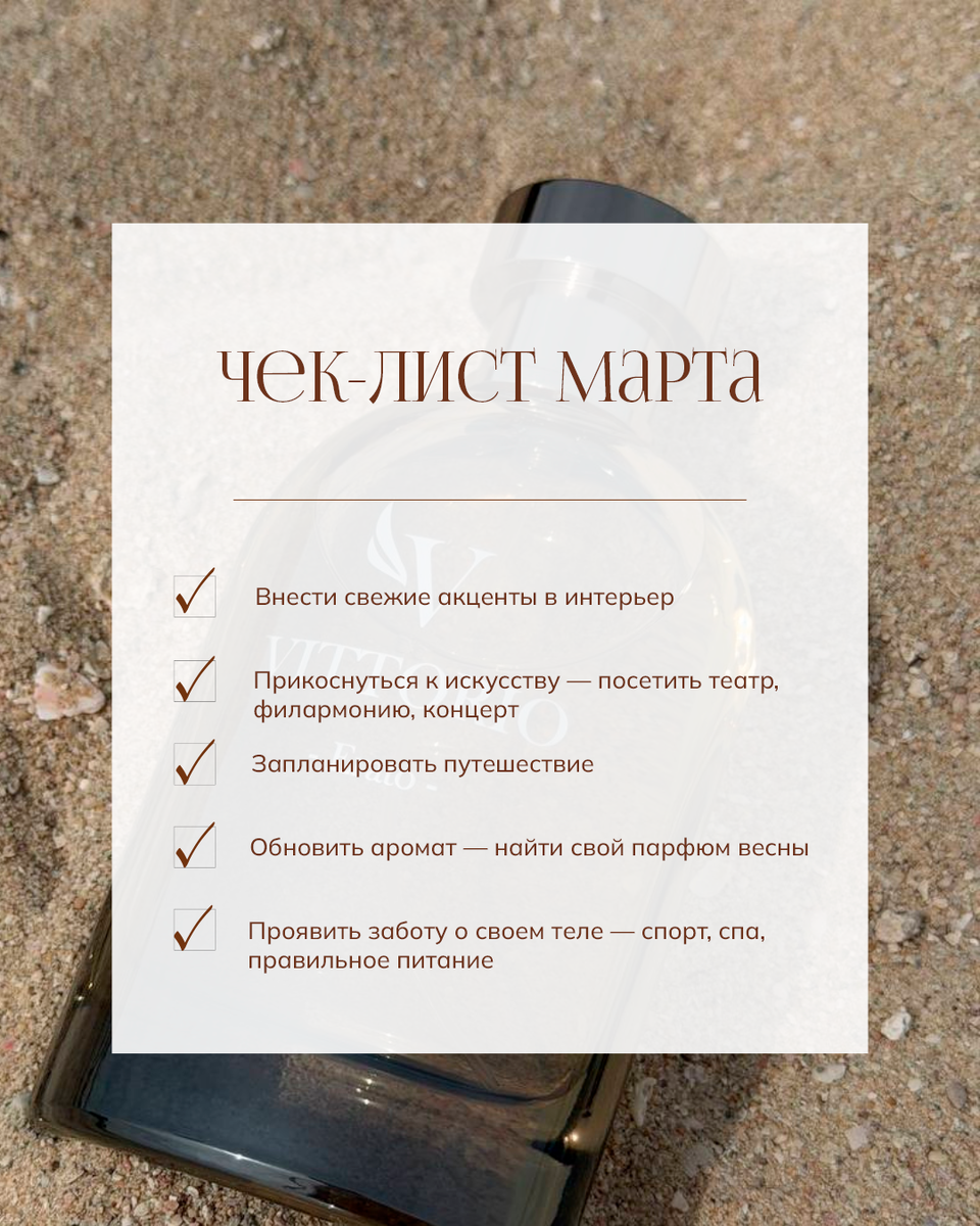 🙍♂️Я воспринимаю каждый месяц как новую ольфакторную главу – со своим настроением, нотами и шлейфом. Пришло время сделать паузу: что из задуманного вы уже воплотили, а что можно с лёгкостью перенести, чтобы прожить месяц без спешки? Проверьте мартовский чек-лист и отметьте, что уже удалось завершить.