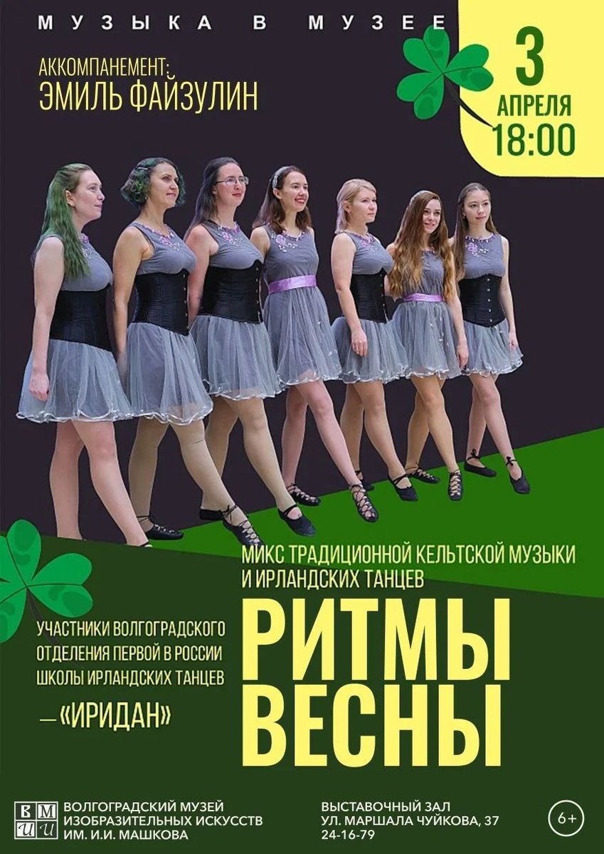 атмосферу таинственной и красивой кельтской культуры. В концерте выступят участники волгоградского отделения первой в России школы ирландских танцев — «Иридан», занимавшие призовые места в российских и международных конкурсах. Танцоры будут выступать под аккомпанемент «живой музыки» в исполнении талантливого музыканта, выпускника Волгоградской консерватории им. П. А. Серебрякова, Эмиля Файзулина. На новом концерте «Ритмы весны» зрителей ждёт микс традиционной кельтской музыки и ирландских танцев. Проекта музея Машкова «Музыка в музее», предполагает посещение не только концертного мероприятия, но и всех действующих, на данный момент в выставочном зале ВМИИ, выставок. Посетители концерта смогут насладиться не только кельтскими музыкой и танцами, но и просмотром выставок. ул. Чуйкова, 37 Тел 24-16-79 #кудасходитьволгоград #танцы #Ирландия #кларнет #концерт