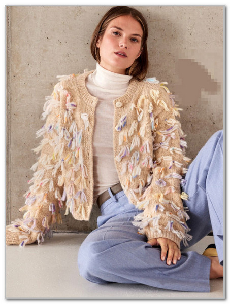 Бахрома: Разрежьте все свободные двойные нити (которые вы оставляли при вязании узора) посередине. Тщательно подровняйте концы нитей в начале и конце рядов, чтобы получилась аккуратная бахрома. Сшейте боковые швы и швы рукавов, втачайте рукава. Пришейте пуговицы и заправьте концы рабочих нитей.