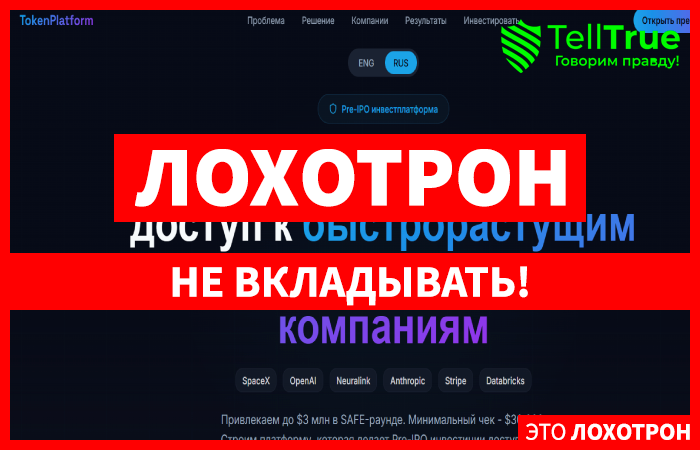 Еще одни мошенники пытаются привлечь к себе побольше доверчивых людей и пишут «Создаем глобальный доступ к быстрорастущим технологическим компаниям». Лжеброкер Token Platform (token-platform.com) сочинил много красивых сказок о своей работе и предложениях для клиентов, да бы успешно и эффективно пользователей обмануть, соответственно стоит быть осторожнее и не связываться. Компания создает видимость работы и профессионализма с целью обмана, так что от ее представителей стоит бежать. Полный обзор: https://telltrue.net/eto-lohotron/token-platform/