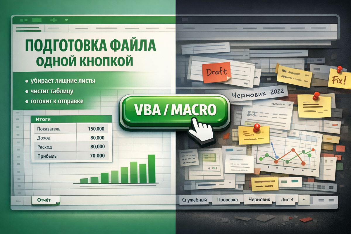 Подготовьте файл к отправке одной кнопкой: VBA сам проверит структуру, почистит лишнее и приведёт Excel в порядок. Подробно разбираем, как автоматически подготовить Excel-файл к отправке с помощью VBA. Один макрос проверяет структуру, очищает лишнее, обновляет данные, приводит листы в аккуратный вид и помогает не отправить сырой или кривой файл.