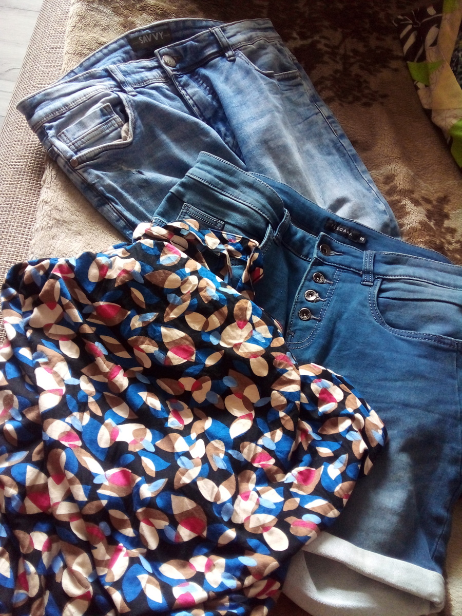 Уже говорила, что самый любимый и ближайший секонд закрылся. Не то, чтобы мне нечего носить, но так удобно было туда заглядывать. Как-то находились красивые вещи именно там на мои нескромные габариты. Напоследок перекопала всё, перемерила многое. Было всё по 100 рублей и 1+1=3 Платье из тянучей вискозы City life. Расценивала, как домашнее, пока не померила с толстовкой. Нравится именно на платье носить толстовку - ничего не торчит, не закатывается, а внизу красиво. Для вечерних прогулок в наушниках подходит)) Шорты Pescara. Иногда бывает нужно и такое. Как раз рассталась с двумя экземплярами, а с ещё одним оставшимися шортами немножко сложные отношения. Так что пусть будет. И по традиции по пути на кассу цапнула мужскую вещь. Забесплатно, так свои 1+1 я выбрала. Джинсы Savvy, очень хорошего качества. Мужу подошли отлично. Он , правда, ворчал, что дырки ему не нравятся. Но бесплатные дырки нравятся))) Не знаю, мне внешне нравятся эти джинсы, тоже почему бы им не быть? Кстати, напишите,