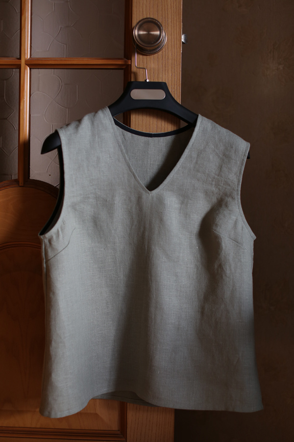 На волне успеха после одеяла, а также по причине "раз уж достала швейную машинку", хотела сшить пробник блузки без рукавов (он же "топ") по старой выкройке Burda, которую когда-то считала удачной для себя. Сшила. Результат не понравился совсем: не стоило входить дважды в эту реку:))) Но не убирать же машинку на такой непозитивной ноте, надо обязательно что-нибудь сшить. Что сшить? Сшила топ из остатков белорусского 100% льна: