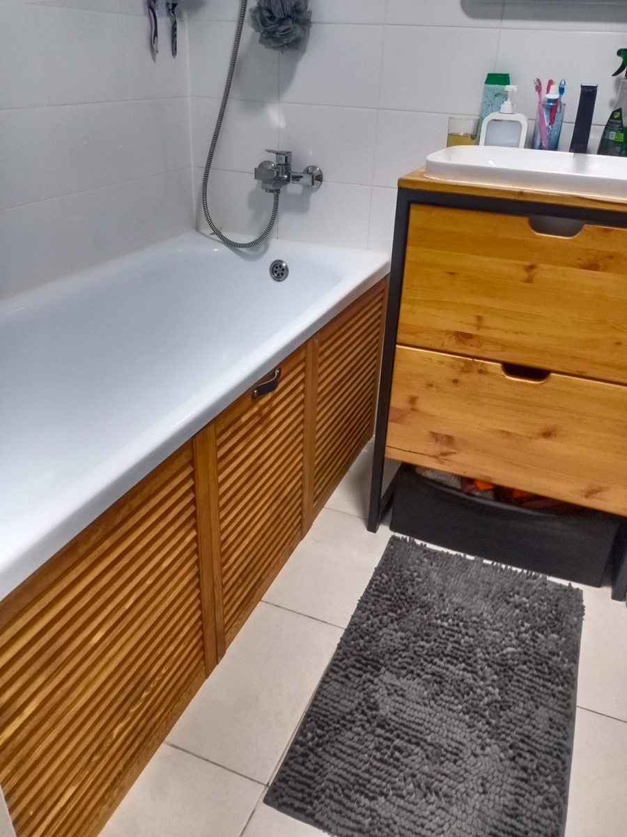 Здравствуйте! Недавно мы столкнулись с трудностями при подборе экрана под ванну, когда переехали в многоэтажку, построенную Группой компаний ПИК. Экран, который установил застройщик, был не совсем удачный (хлипковат и плохо держался), поэтому появилась необходимость установить новый. Объехали много магазинов, были на строительном рынке. Все экраны под ванну, которые продаются в основной массе магазинов, сделаны из пластика, также хлипкие, дребезжат и плохо держатся. Было принято решение изготовить экран под ванну самостоятельно, из массива дерева, благо, распиловочный станок и другие необходимые инструменты и оборудование у нас в наличии. Экран решили изготовить из трёх жалюзийных дверок, которые купили готовые. Ширина нашего проёма 167 см, высота 57, поэтому купили дверки высотой 60 см и шириной 60 см (две штуки) и 50 см (одна штука). Аккуратно отрезав на станке края под нужный размер мы получили экран под ванну, состоящий из трёх съёмных дверок. Далее приступили к установке. Для эт