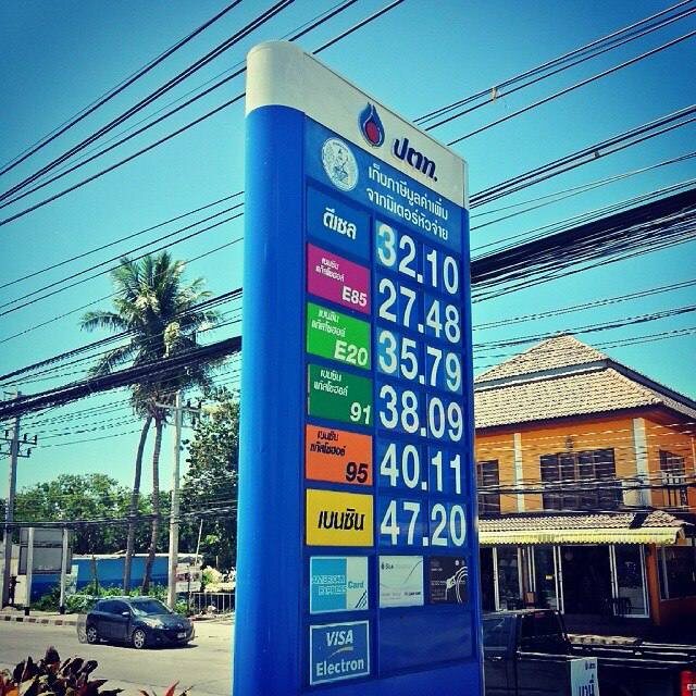 Слева цены на топливо, на Самуи, в сентябре 2014 года, справа - сегодняшние. Причём в сентябре 2014-го это уже были цены после снижения.