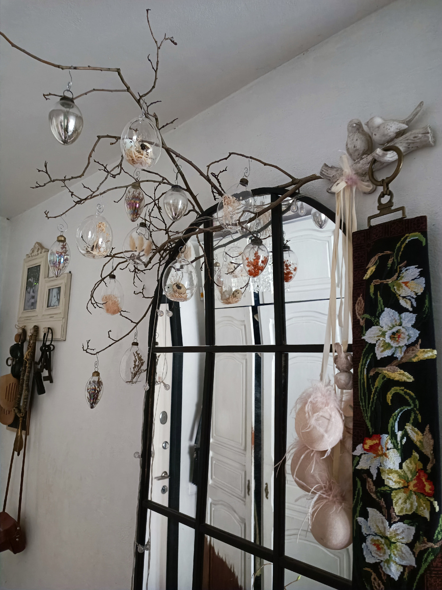 А с ветками зеркало получило свою законченность - оставлю их до зимы. Яйца - из Фикс Прайс, Ашана и Фамилии, были куплены уже больше года назад, с хорошими скидками.