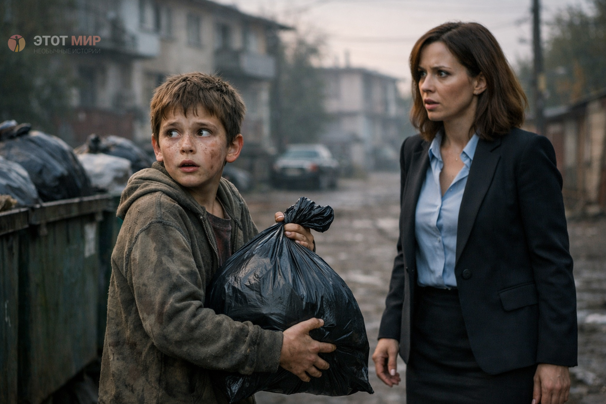 Проезжая мимо контейнерной площадки, она заметила движение. Мальчик, на вид лет одиннадцати, стоял, склонившись над мусорным баком, перебирая содержимое и перекладывая что-то в большой мешок. Его одежда была грязной, рукава закатаны, движения — быстрые и отработанные.
