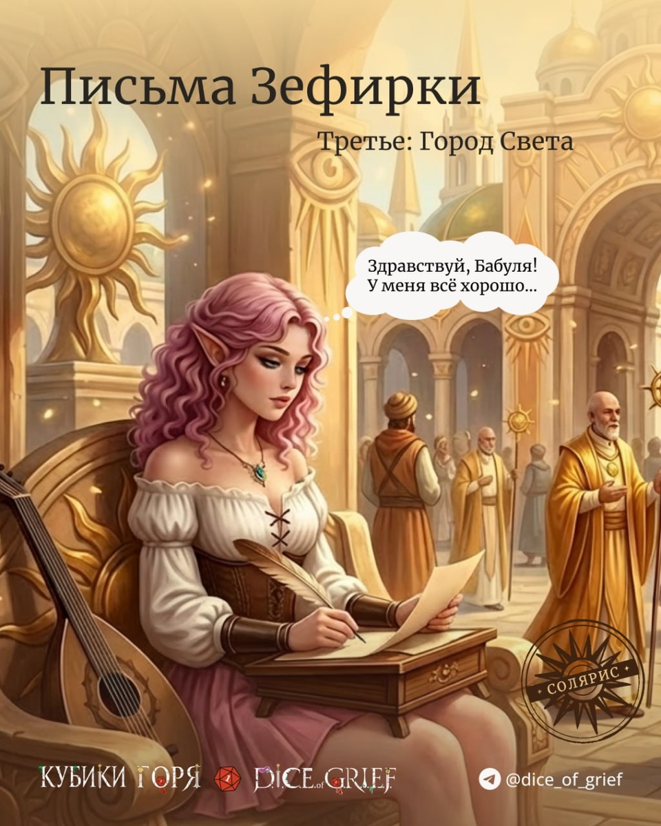 Это обернулось попаданием в одну "пикантную ситуацию", из-за чего она не смогла отправить письмо вовремя. Вот часть письма о тех событиях: Пахнет духами "Сад Фей". Здравствуй, дорогая Бабуля! Вот и вернулась я в Солярис. И вроде как к мирной жизни вернулась, но не тут-то было. Наш друг-монах Эллиот оказался инквизитором! Но он такой милый, совсем не страшный (признаться, я немного побаиваюсь инквизиторов, хотя я честный законопослушный гражданин, верующий в боженьку нашего Пелора). И Эллиот очень хороший, но иногда немного глупый. Или, это я глупая, и зря пытаюсь с ним флиртовать. В общем, наше первое свидание в канализации, куда он меня позвал, обернулось встречей с культистами. Они сотворяли какие-то обряды, чтобы накормить голодных, но это, как мне умные дяденьки объяснили, к смуте ведёт. Да и как потом выяснилось, не от чистого сердца они всё это делали. В канализации видели шпиона Дэйса, поганца такого! Я почти не испугалась, а наш Эллиот за ним побежал, дурачок. Ну и напоро
