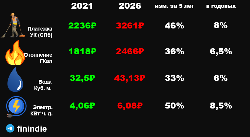 Одна из самых больных тем - рост тарифов ЖКХ. Но если взглянуть на них ретроспективно и взяв в руки калькулятор, всё окажется не так печально. Это данные из моих платёжек, оплаченных в марте 2021 и в марте 2026 года. Это Санкт-Петербург. ▪️ Платежка УК за содержание дома*: 2236₽ → 3261₽, рост на 9% в год. ▪️ Отопление, 1 гигакалория: 1818₽ → 2466₽, рост на 7% в год. ▪️ Вода, 1 кубометр: 32,50₽ → 43,13₽, рост на 6,5% в год. ▪️ Электричество, 1 КВт*ч, день: 4,06₽ → 6,08₽, рост на 10% в год. *В платежку за дом за 2026 также добавил вывоз мусора (535₽), т.к. в 2021 году такой отдельной графы не было, и она, вероятно, была включена куда-то ещё. Тарифы растут в среднем на 6-9% в год, т.е. на уровне официальной инфляции. Я получил огромные зимние платежки, и подумал, что тарифы сильно выросли. Но связано это оказалось не с ростом тарифов, а с холодной погодой и ростом объемов отопления. В моём бюджете статья "Коммунальные услуги" - это всего 3% от всех расходов. И это с учетом оплаты домашне