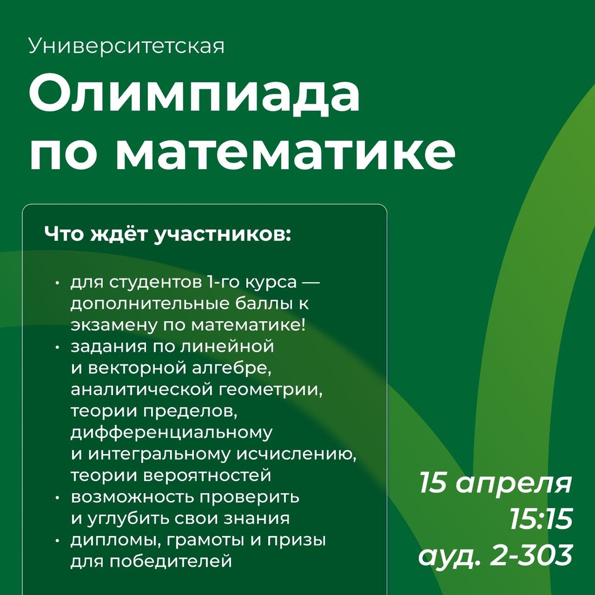 ! ΠΠ°ΡΠ΅Π΄ΡΠ° Π²ΡΡΡΠ΅ΠΉ ΠΌΠ°ΡΠ΅ΠΌΠ°ΡΠΈΠΊΠΈ ΠΏΡΠΈΠ³Π»Π°ΡΠ°Π΅Ρ ΡΡΡΠ΄Π΅Π½ΡΠΎΠ² 1β4 ΠΊΡΡΡΠΎΠ² ΠΏΡΠΈΠ½ΡΡΡ ΡΡΠ°ΡΡΠΈΠ΅ Π² Π΅ΠΆΠ΅Π³ΠΎΠ΄Π½ΠΎΠΉ ΠΎΠ»ΠΈΠΌΠΏΠΈΠ°Π΄Π΅, ΠΊΠΎΡΠΎΡΠ°Ρ ΡΠΎΡΡΠΎΠΈΡΡΡ 15 Π°ΠΏΡΠ΅Π»Ρ 2026 Π³ΠΎΠ΄Π°. Π§ΡΠΎ ΠΆΠ΄ΡΡ ΡΡΠ°ΡΡΠ½ΠΈΠΊΠΎΠ²: βΈ Π·Π°Π΄Π°Π½ΠΈΡ ΠΏΠΎ Π»ΠΈΠ½Π΅ΠΉΠ½ΠΎΠΉ ΠΈ Π²Π΅ΠΊΡΠΎΡΠ½ΠΎΠΉ Π°Π»Π³Π΅Π±ΡΠ΅, Π°Π½Π°Π»ΠΈΡΠΈΡΠ΅ΡΠΊΠΎΠΉ Π³Π΅ΠΎΠΌΠ΅ΡΡΠΈΠΈ, ΡΠ΅ΠΎΡΠΈΠΈ ΠΏΡΠ΅Π΄Π΅Π»ΠΎΠ², Π΄ΠΈΡΡΠ΅ΡΠ΅Π½ΡΠΈΠ°Π»ΡΠ½ΠΎΠΌΡ ΠΈ ΠΈΠ½ΡΠ΅Π³ΡΠ°Π»ΡΠ½ΠΎΠΌΡ ΠΈΡΡΠΈΡΠ»Π΅Π½ΠΈΡ, ΡΠ΅ΠΎΡΠΈΠΈ Π²Π΅ΡΠΎΡΡΠ½ΠΎΡΡΠ΅ΠΉ βΈ Π²ΠΎΠ·ΠΌΠΎΠΆΠ½ΠΎΡΡΡ ΠΏΡΠΎΠ²Π΅ΡΠΈΡΡ ΠΈ ΡΠ³Π»ΡΠ±ΠΈΡΡ ΡΠ²ΠΎΠΈ Π·Π½Π°Π½ΠΈΡ βΈ Π΄ΠΈΠΏΠ»ΠΎΠΌΡ, Π³ΡΠ°ΠΌΠΎΡΡ ΠΈ ΠΏΡΠΈΠ·Ρ Π΄Π»Ρ ΠΏΠΎΠ±Π΅Π΄ΠΈΡΠ΅Π»Π΅ΠΉ ΠΠ»Ρ ΡΡΡΠ΄Π΅Π½ΡΠΎΠ² 1βΠ³ΠΎ ΠΊΡΡΡΠ° β Π΄ΠΎΠΏΠΎΠ»Π½ΠΈΡΠ΅Π»ΡΠ½ΡΠ΅ Π±Π°Π»Π»Ρ ΠΊ ΡΠΊΠ·Π°ΠΌΠ΅Π½Ρ ΠΏΠΎ ΠΌΠ°ΡΠ΅ΠΌΠ°ΡΠΈΠΊΠ΅! ΠΠ°ΠΊ ΡΡΠ°ΡΡΠ²ΠΎΠ²Π°ΡΡ: ΠΠΎ 14:00 15 Π°ΠΏΡΠ΅Π»Ρ ΠΎΡΠΏΡΠ°Π²ΡΡΠ΅ ΠΏΠΈΡΡΠΌΠΎ Π½Π° e-mail: mathschool_pstu@mail.ru Π ΠΏΠΈΡΡΠΌΠ΅ ΡΠΊΠ°ΠΆΠΈΡΠ΅: βΈ Π€ΠΠ (ΠΏΠΎΠ»Π½ΠΎΡΡΡΡ) βΈ Π³ΡΡΠΏΠΏΡ (Π½Π°ΠΏΡΠΈΠΌΠ΅Ρ, ΠΠΠ±-ΠΠ-24-1) βΈ ΡΠ΅ΠΌΡ ΠΏΠΈΡΡΠΌΠ°: Β«ΡΡΠ°ΡΡΠΈΠ΅ Π² ΠΎΠ»ΠΈΠΌΠΏΠΈΠ°Π΄Π΅ ΠΏΠΎ ΠΌΠ°ΡΠ΅ΠΌΠ°ΡΠΈΠΊΠ΅Β» π ΠΠΎΠ³Π΄Π°: 15 Π°ΠΏΡΠ΅Π»Ρ, 15:15 π ΠΠ΄Π΅: 2-ΠΉ ΡΡΠ΅Π±Π½ΡΠΉ ΠΊΠΎΡΠΏΡΡ, Π°ΡΠ΄. 2-303 ΠΡΠΎΠ²Π΅ΡΡΡΠ΅ ΡΠ²ΠΎΠΈ Π·Π½Π°Π½ΠΈΡ ΠΈ ΠΏΠΎΠ±ΠΎΡΠΈΡΠ΅ΡΡ Π·Π° ΠΏΠΎΠ±Π΅Π΄Ρ! π #Π‘ΠΠ±ΠΠΠ’Π£ #Π‘ΠΠ±ΠΠΠ’Π£_Π°Π½ΠΎΠ½Ρ π» ΠΠΠ₯ | π² ΠΠ | π ΠΠΠΠ
