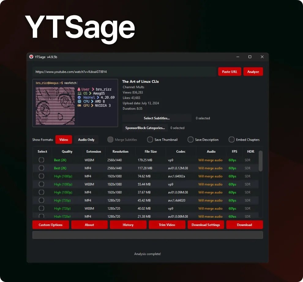Обзор нового десктопного приложения YTSage для скачивания видео с YouTube в любом качестве, включая HDR, с поддержкой плейлистов, субтитров и автоматического удаления рекламы. Среди ключевых решений и фактов: YTSage — десктопное приложение для скачивания видео с YouTube без ограничений по качеству, включая HDR; Поддерживает извлечение звука отдельно, работу с плейлистами и субтитрами, а также вырезание фрагментов видео; Функция SponsorBlock автоматически удаляет рекламные вставки и спонсорские сегменты из роликов; Работает на Windows, macOS и Linux, не требует установки дополнительных… Читать полностью