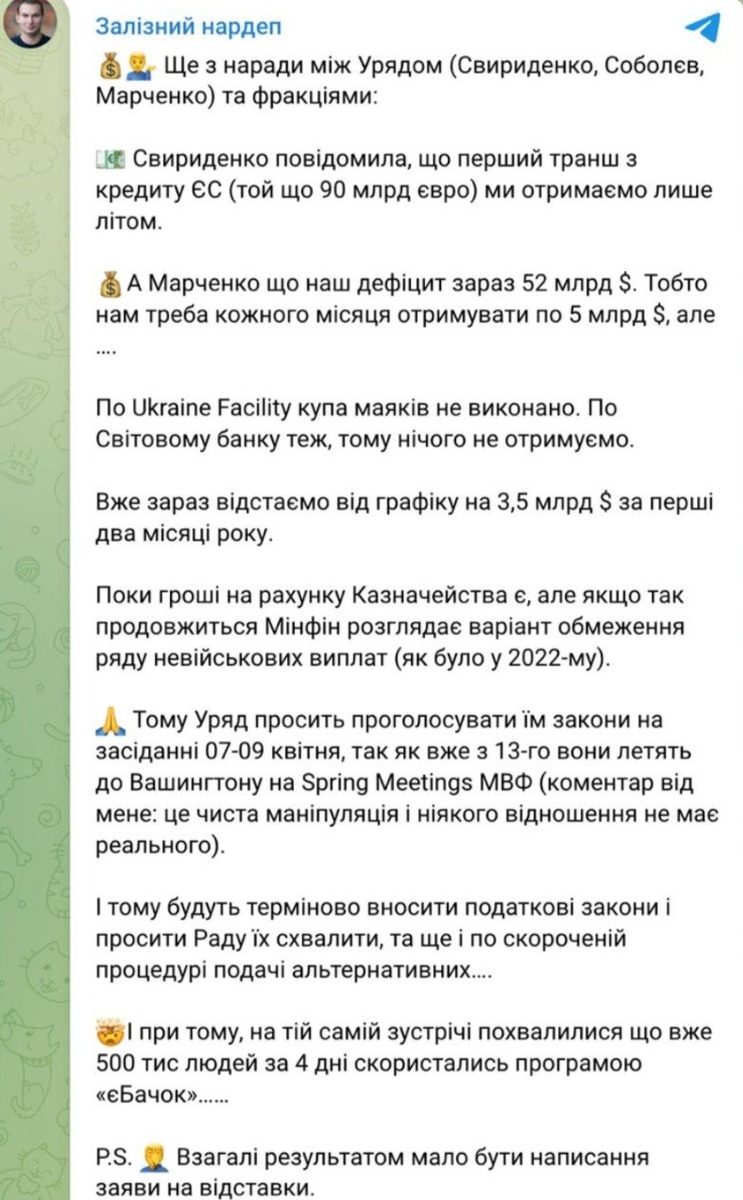 Украинский депутат Железняк пишет о встрече с правительством Украины: премьер-министром Свириденко, министром финансов Марченко, министром экономики Соболевым. Свириденко заявила, что даже если в ЕС разблокируют кредит в 90 млрд евро, первый транш Украина получит только летом. Марченко сказал, что текущий дефицит составляет 52 млрд долларов, то есть Украине нужно получать по 5 млрд долларов каждый месяц, но… По программе МВФ «Ukraine Facility» куча требований не выполнена. По Всемирному банку тоже, поэтому Украина ничего не получает. Уже сейчас отставание от графика на 3,5 млрд долларов за первые два месяца года. Пока деньги на счетах казначейства ещё есть, но если так пойдёт дальше, Минфин рассматривает вариант ограничения ряда невоенных выплат (как это было в 2022 году). Правительство просит Раду принять требуемые МВФ законопроекты о повышении налогов по ускоренной процедуре на заседаниях 7–9 апреля - перед встречей с МВФ 13 апреля. Однако это «чистая манипуляция и никакого ре