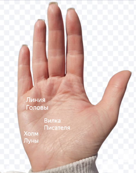 Часто на ладонях можно увидеть Вилку писателя. Но не все обладатели Вилки писателя являются писателями и не все гениальные писатели имеют Вилку писателя. Почему? Давайте разбираться. Вилка Писателя это развилка на Линии Головы, когда от Линии Головы отходит ветвь в направлении Холма Луны. Методом датировки вычисляется возраст, в котором Вилка писателя даст о себе знать. Линия Головы отвечает за тип мышления человека, когнитивные функции (память, внимание, скорость реакций), интеллект, состояние его головного и спинного мозга. Прямая Линия Головы - признак логического, аналитического, рационального типа мышления, активного левополушарного мышления (интеллект, расчеты, логика, анализ, алгоритмы, память, распознавание, организация речи). Изогнутая Линия Головы или идущая в зону Холма Луны - признак богатого воображения, фантазии, оригинального (креативного) типа мышления, мечтательности, иллюзий, интуиции, образного мышления, визуального восприятия, ориентации в пространстве, чувственн
