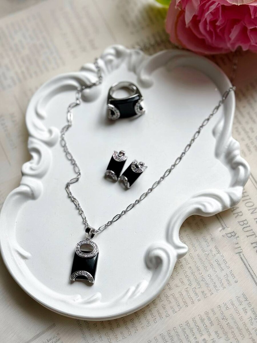 🌌 Чёрное стекло в сочетании с серебряным металлом и деликатным сиянием кристаллов создаёт образ сдержанной роскоши.Такой комплект легко вписывается как в вечерние образы, так и в лаконичный повседневный стиль, добавляя глубины и выразительности. Колье 2940 Кольцо 2940 Серьги 2940 ✨Нажмите для заказа ✉️ Нажмите чтобы задать вопрос