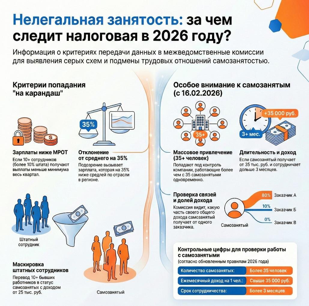 Минтруд внес изменения в Перечень сведений и информации, которые налоговые органы передают межведомственным комиссиям по противодействию нелегальной занятости и в территориальные органы Роструда (см. Приказ Минтруда России от 19 ноября 2025 г. № 657н (зарег. в Минюсте 04.02.2026)). Давайте разберёмся, какую информацию налоговики передают в межведомственные комиссии по борьбе с нелегальной занятостью и в трудинспекции! 📋 Что именно передают? 1️⃣ ПОДОЗРИТЕЛЬНО НИЗКИЕ ЗАРПЛАТЫ Если компания или ИП платит меньше МРОТ как минимум 10 сотрудникам каждый месяц квартала, и таких работников больше 10% от общей численности — это попадает в отчёт. 2️⃣ ВЫЯВЛЕННЫЕ НАРУШЕНИЯ Когда налоговая проводит проверку и находит признаки нелегальной занятости, эта информация тоже передаётся в комиссию. Указываются все детали: кто нарушил, когда и что именно. 3️⃣ АКТИВНАЯ РАБОТА С САМОЗАНЯТЫМИ (ОБНОВЛЕНО С 16.02.2026) Обращают внимание на компании, которые сотрудничают более чем с 35 самозанятыми, если каждый и