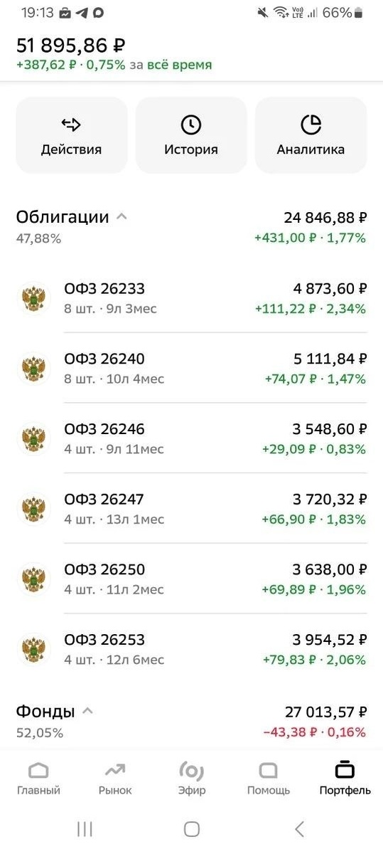 Не ИИР Суть моей стратегии: пополнил, купил и забыл до следующего пополнения. Никакого анализа и отбора бумаг. Срок инвестирования минимум 10 лет. Цель - доп доход в размере 30 000 рублей. Состав портфеля: 🔹 70% - защитная часть 🔹 30% - рост Его ещё называют «вечнозелёным портфелем». Потому что за счёт защитной части он всегда в плюсе (ну или около того). 📌 Защитная часть (70%) 30% - ОФЗ 6 выпусков на срок от 9 до 15 лет. Мне просто нравится, когда деньги капают ежемесячно - не более 😅 15% - БПИФ (SBRB - корпоративные облигации) Чтобы не заморачиваться с отбором бумаг и не следить за новостями. Хватило детского портфеля 🫣 15% — БПИФ (SBFR - флоатеры) Корпоративные облигации с плавающим купоном. В условиях высокой ставки решил прикупить. По мере снижения - буду потихоньку избавляться. 10% - БПИФ (SBGD - золото) Фонд, инвестирующий в физическое золото. Защита от кризисов. Хотелось бы ещё недвижимость, но для меня пока нет подходящего фонда. Ну и ладно, обойдёмся без неё. 📌 Ростовая