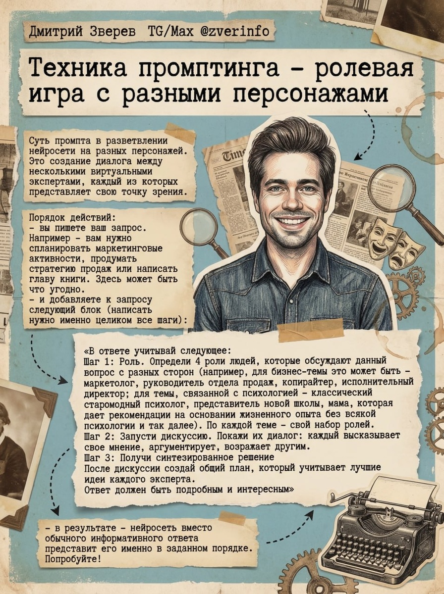 У вас было такое: при обсуждении в компании людей какого-то сложного вопроса вдруг кто-то затрагивал такую его сторону, про которую до этого никто и не думал? Или высказывал интересное мнение, которое могло вообще коренным образом все изменить? Наверняка. В этом и состоит сила обсуждений - посмотреть на ситуацию с разных сторон. И про это сегодняшний промпт. Его суть как в разветвлении нейросети на разных персонажей. Это создание диалога между несколькими виртуальными экспертами, каждый из которых представляет свою точку зрения. Порядок действий: 😛вы пишете ваш запрос. Например - вам нужно спланировать маркетинговые активности, продумать стратегию продаж или написать главу книги. Здесь может быть что угодно. 😛и добавляете к запросу следующий блок (написать нужно именно целиком все шаги): «В ответе учитывай следующее: Шаг 1: Роль. Определи 4 роли людей, которые обсуждают данный вопрос с разных сторон (например, для бизнес-темы это может быть – маркетолог, руководитель отдела продаж, к