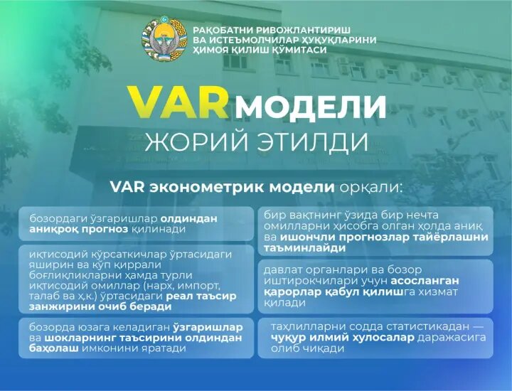 В пресс-службе Комитета по развитию конкуренции и защиты прав потребителей Республики Узбекистан сообщили, что в эконометрический анализ внедрена модель VAR, или векторная авторегрессия. Данная работа проводится Центром исследований политики конкуренции и прав потребителей при Комитете по конкуренции, который последовательно внедряет современные научные подходы в сферу экономического анализа, мониторинга рыночных процессов и прогнозирования.