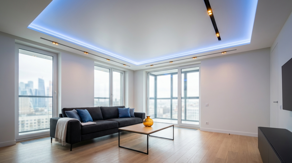 Стоимость натяжного потолка в стандартный совмещенный санузел (5 м²) в Москве в 2026 году составляет от 7 500 до 12 000 рублей под ключ. В эту цену входит качественное полотно MSD Premium, алюминиевый профиль, обработка углов, установка светильников и работа мастеров. Если вы выбираете премиальный теневой профиль или световые линии, цена будет выше, но эстетический эффект того стоит — интерьер сразу переходит в разряд дизайнерских.