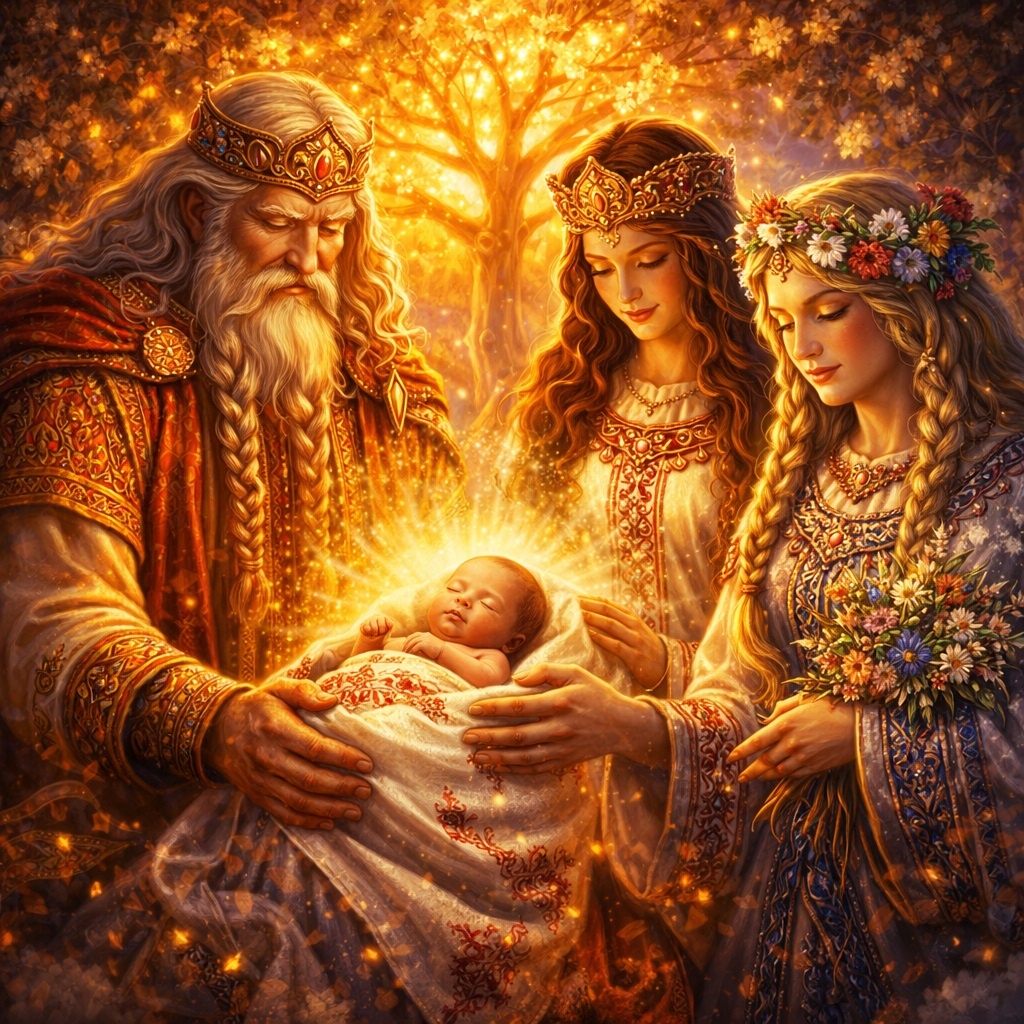 Современный человек привык считать рождение ребёнка событием семьи. Максимум — рода. Но в древней культуре это было событие перехода. Между небытия и бытия, между кровью и именем, между телом и судьбой. Ребёнок не просто появлялся на свет. Он входил в уже населённый силами мир, где нужно было не только выжить телом, но и получить свою долю, своё место, свою связь с родом и защиту от невидимых угроз.