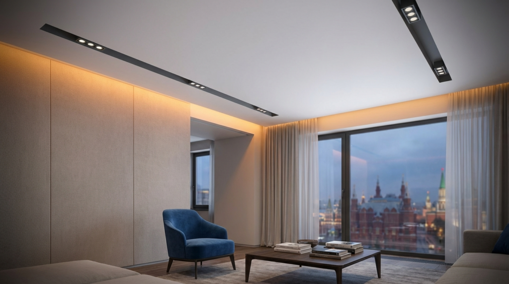 Чёрный потолок без правильного света — это действительно мрачно. Но с современными системами освещения он превращается в главный арт-объект квартиры. В 2026 году основным трендом в Москве стали магнитные трековые системы на чёрном фоне. Когда чёрный трек интегрируется в чёрное матовое полотно, сами источники света как бы «утопают» в потолке. Вы видите только направленные лучи света, но не видите самих светильников. Это создаёт архитектурный, «дорогой» свет, который мы часто монтируем в современных ЖК бизнес-класса.