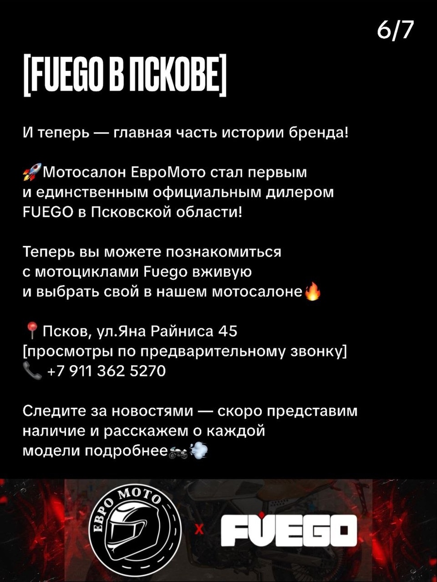 ! Теперь у нас есть единственный официальный дилер в Псковской области, а это прекрасная возможность для её жителей приобрести мототехнику Fuego! Добавляйтесь в группу vk.ru/evro_moto, чтобы не пропустить новости!