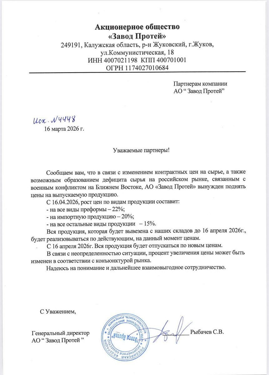 Сегодня очередная траурная новость для предпринимателей, хотя, казалось бы, куда уж дальше этого краткого списка: · НДС пришёл в гости буквально к каждому предпринимателю, а лимит годового дохода для освобождения от НДС на упрощенке постепенно снизится до 10 млн. · Дробление бизнеса на кучу ИП отслеживается практически влёт. · Карго-поставки приказали долго жить. · Маркетплейсы только и занимаются, что повышают комиссии и прочие расходы. · Часть соцсетей запрещена, часть – замедлена, реклама мимо кассы. И тут на картине появляются ещё и те, о ком в ажиотаже первых трёх месяцев 2026 совершенно забыли, а зря. Встречайте, его Величество Поставщики! Краткое описание письма о повышении с 16 апреля отпускных цен, разосланного своим партнёрам одним из крупнейших производителей упаковки для косметической отрасли «Завод Протей», скан прилагается. 1. На все виды преформ +22%. 2. На импортную продукцию +20%. 3. На все остальные виды продукции +15%. Почему-то я уверен, что Протей в своём порыве да